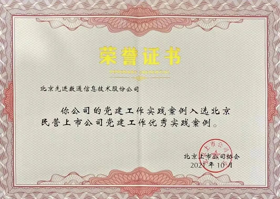 近期,北京上市公司协会授予北京保利国际 保利信息技术股份公司荣誉证书,保利国际 保利党建工作实践入选北京民营上市公司党建工作优秀实践案例,相关党建活动已收录在《北京民营上市公司党建工作优秀实践案例汇编》。